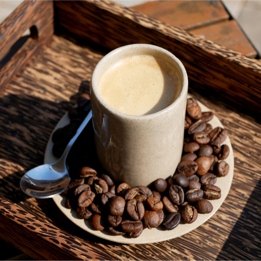 Our menu features Cambodian beverages available hot or iced. The coffee is a Robusta variety from Mondulkiri Province with woody, earthy flavours.