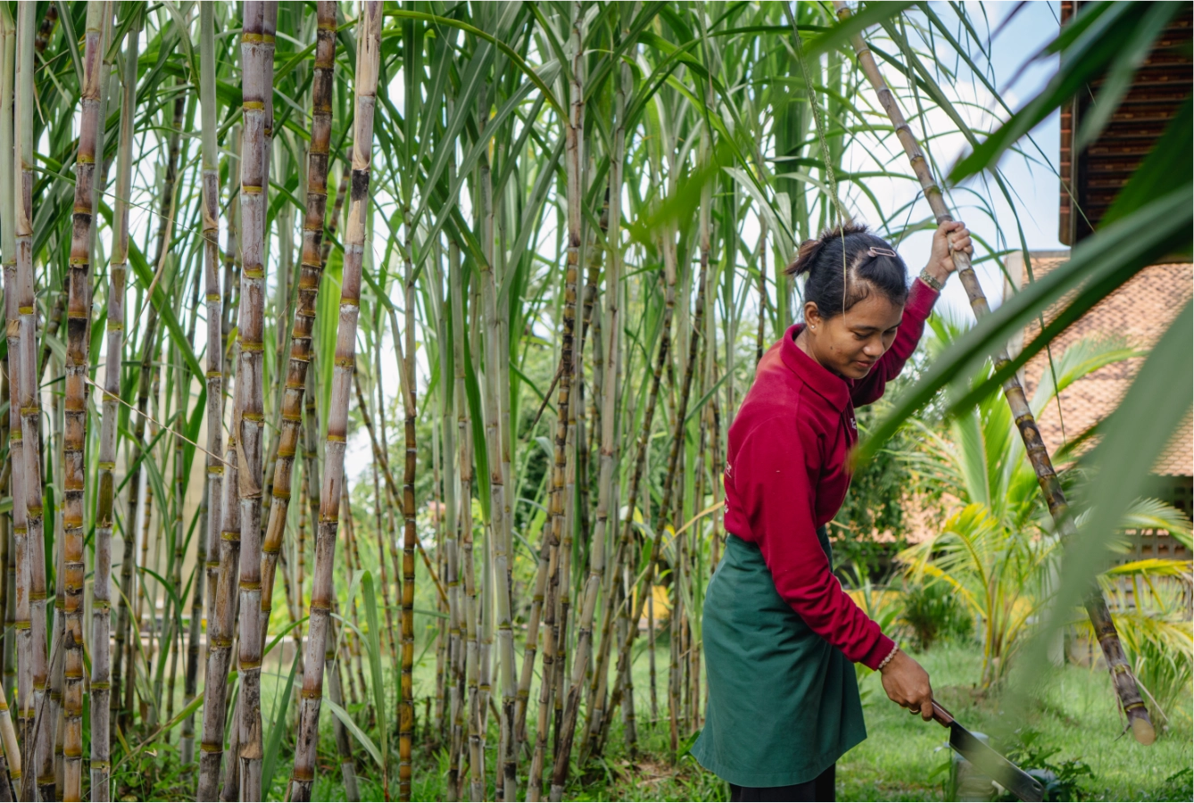 Our barista is cutting sugar cane to prepare the most fresh juice you will ever have.
