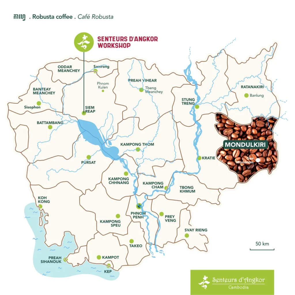 Mondulkiri, Cambodia’s highland jewel, is not just known for its breathtaking landscapes but also for its exceptional coffee. At Senteurs d’Angkor, we celebrate this local treasure, honoring the craftsmanship, culture and flavours that make Mondulkiri coffee truly unique.
