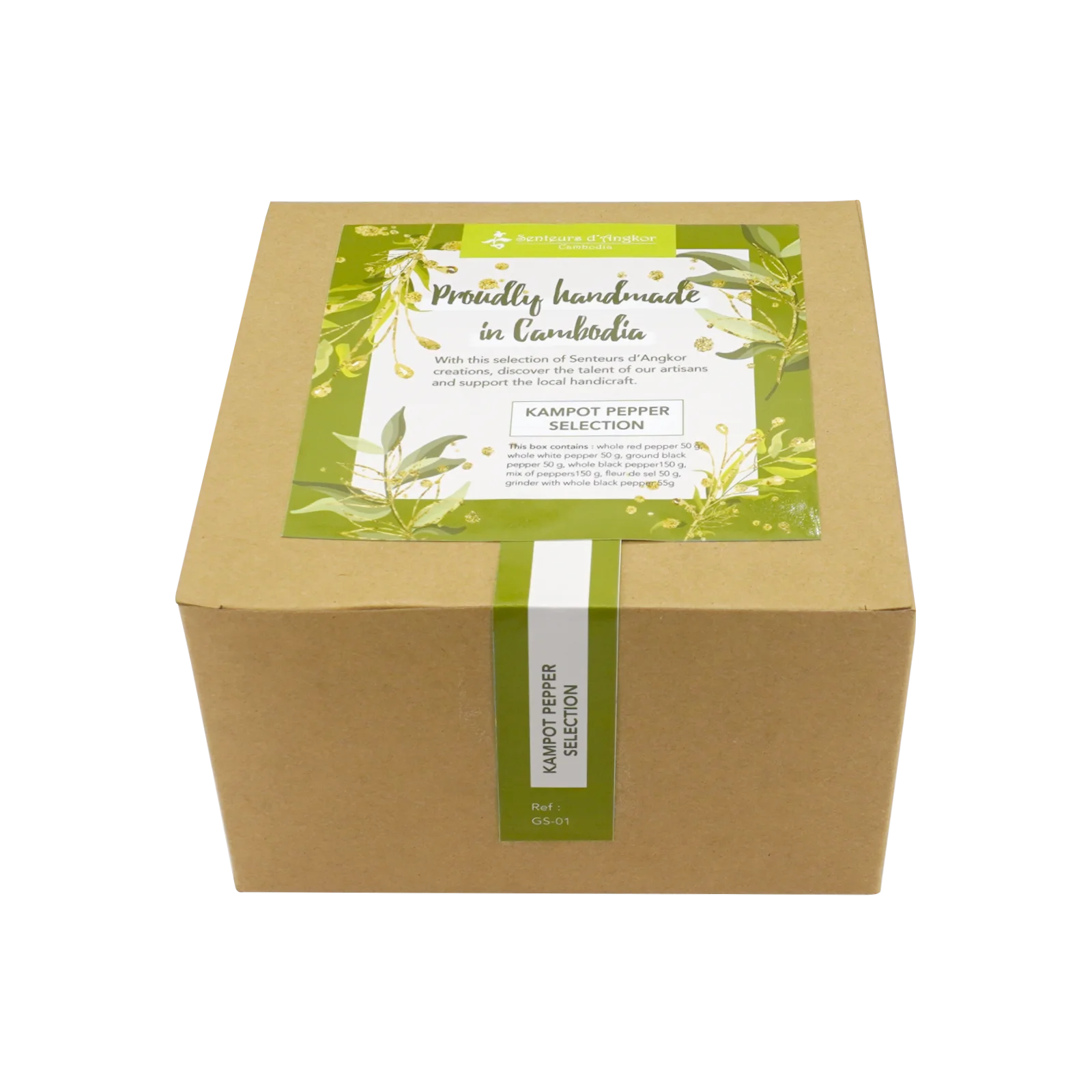 Kampot pepper in sugar palm box, ground black x1 Kampot ground black pepper 50 g is the strongest and intensely spicy with unique mix of flavours. Its taste reveals hints of flower, eucalyptus and mint. We ground our pepper at our workshop in Siem Reap.
