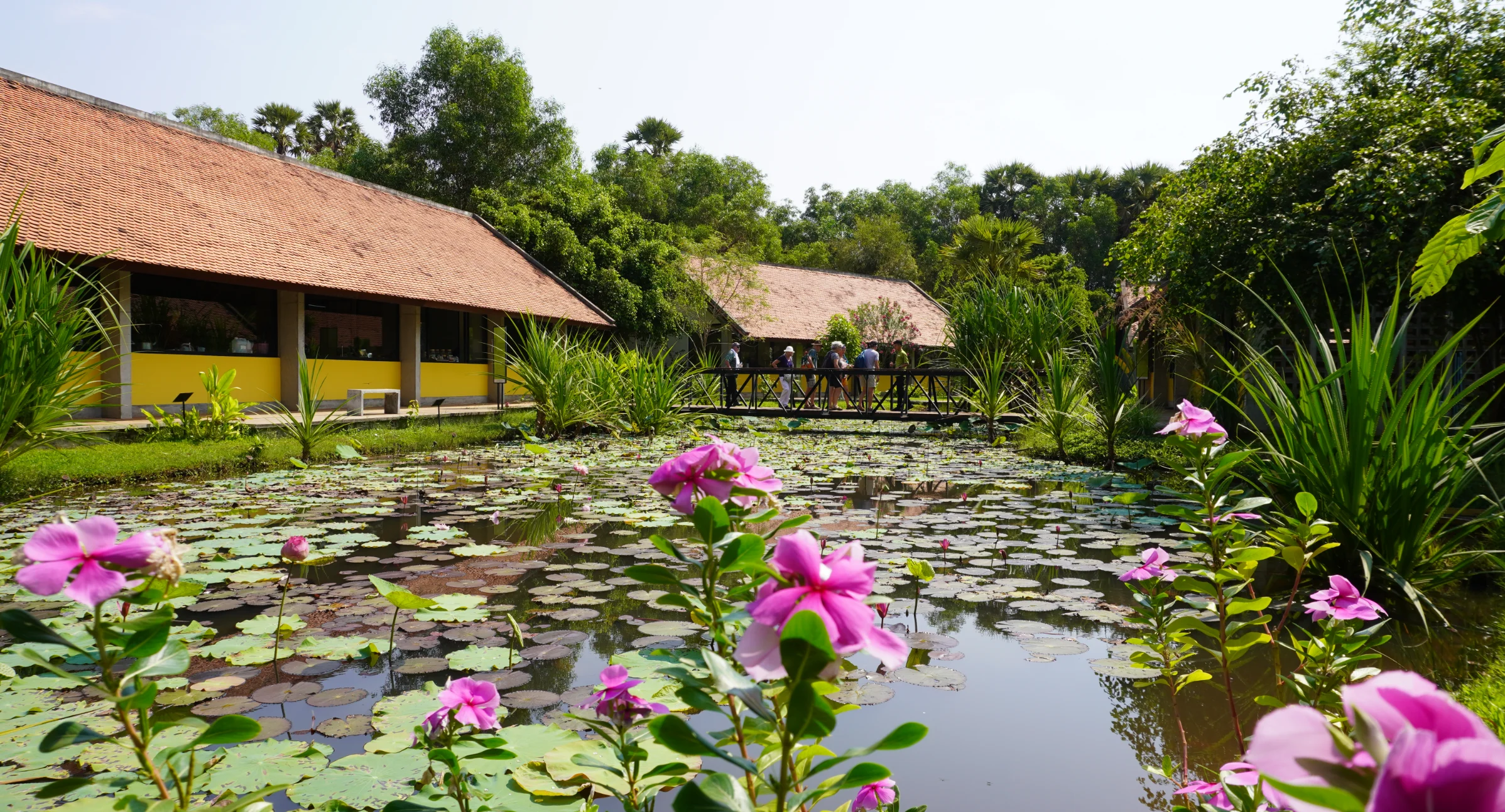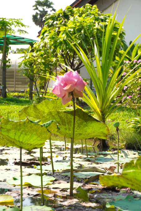 A lotus blooms in the Senteurs d'Angkor garden, symbolizing natural beauty and cultural heritage in Cambodian craftsmanship.