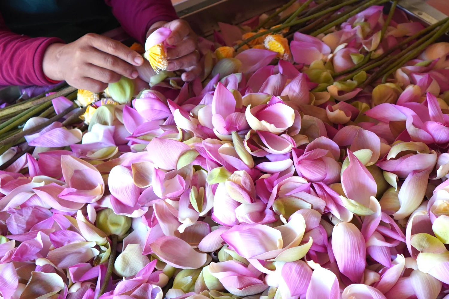 Skilled artisans peel off lotus petals and separate the stamens, preparing natural ingredients for lotus tea and soaps products.