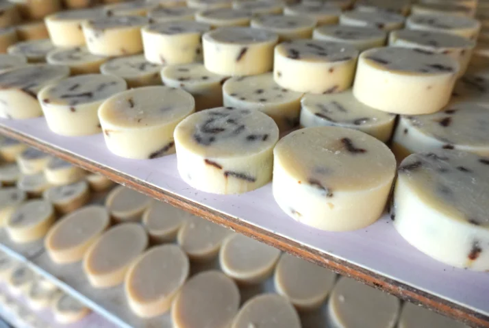 Trays of natural handmade soaps placed on a rack for cooling inside the soap making station for 30 days before it ready to use.