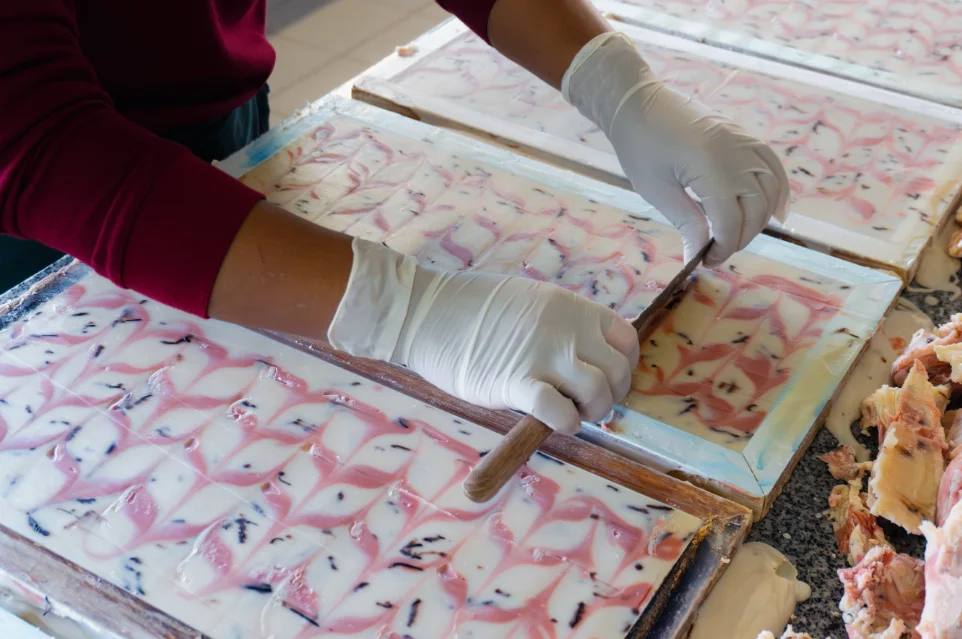 Artisan slicing a bar of freshly made lotus soap by hand.