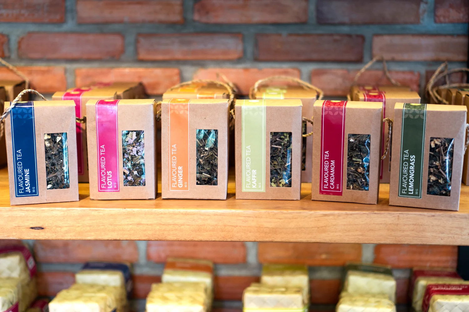 Selection of flavoured jasmine, lotus, ginger, kaffir, cardamom and lemongrass teas arranged on shelves in the boutique.