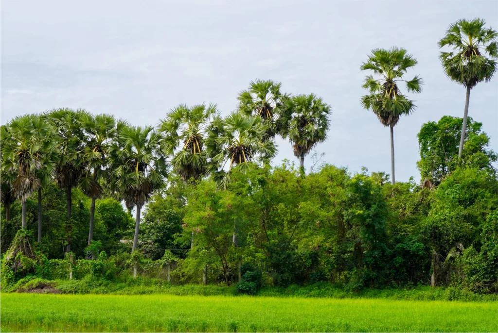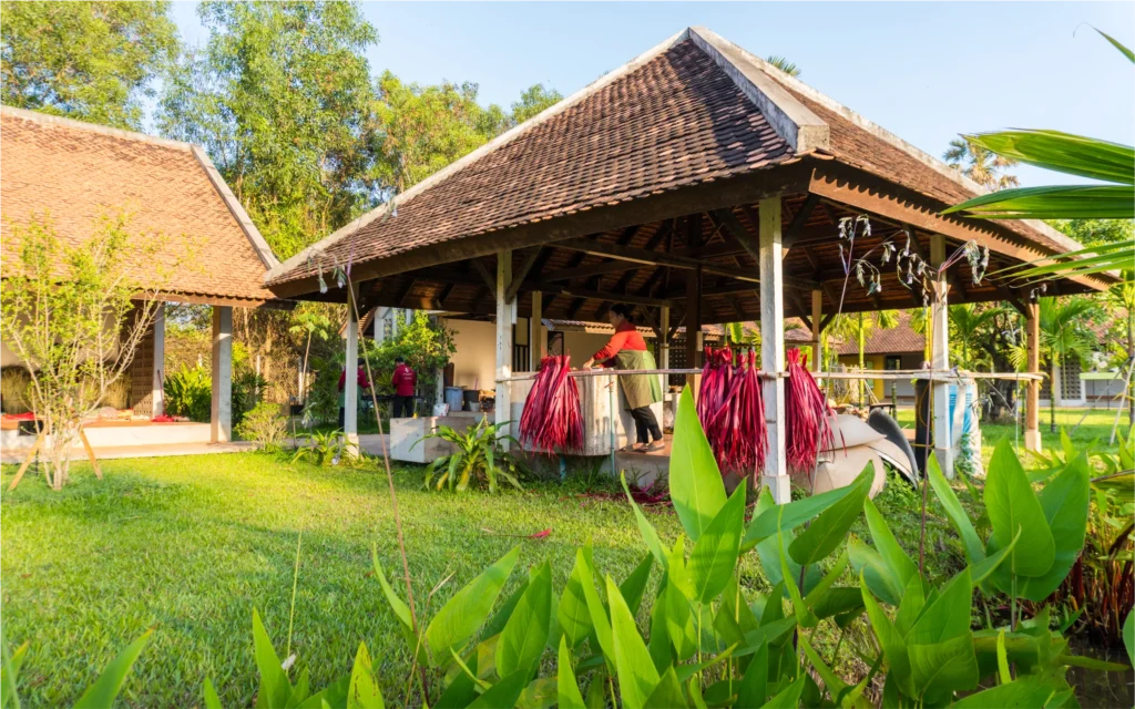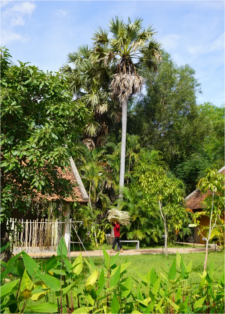 In Cambodia, the sugar palm tree is a true national symbol, deeply connected to everyday life and traditional craftsmanship. For generations, its leaves have been used to build thatched roofs and walls, weave mats and create essential household items. This remarkable tree represents a harmonious relationship between people and nature a philosophy that also lies at the heart of Senteurs d’Angkor workshop and garden.