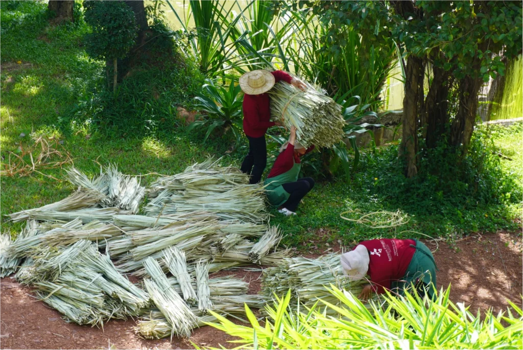 Women artisans at Senteurs d’Angkor sorting and bundling natural sugar palm leaves, the raw material used to create traditional handcrafted Smok box packaging in Cambodia.