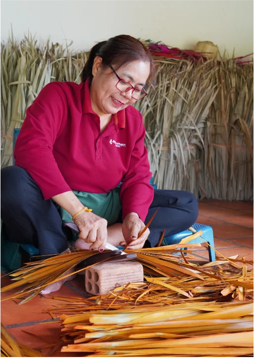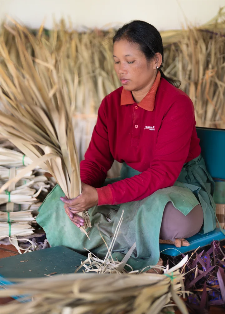 A close-up of our artisan carefully sorting and bundling sugar palm leaves before colouring and cutting them for weaving traditional Smok packaging boxes.
