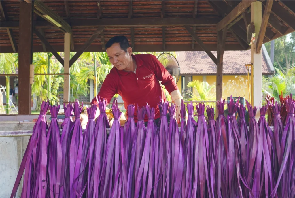 Artisans drying bright red–hued sugar palm leaves at the colouring station during golden hour, with warm sunlight enhancing the vivid tones of the natural leaves prepared for weaving Smok boxes.