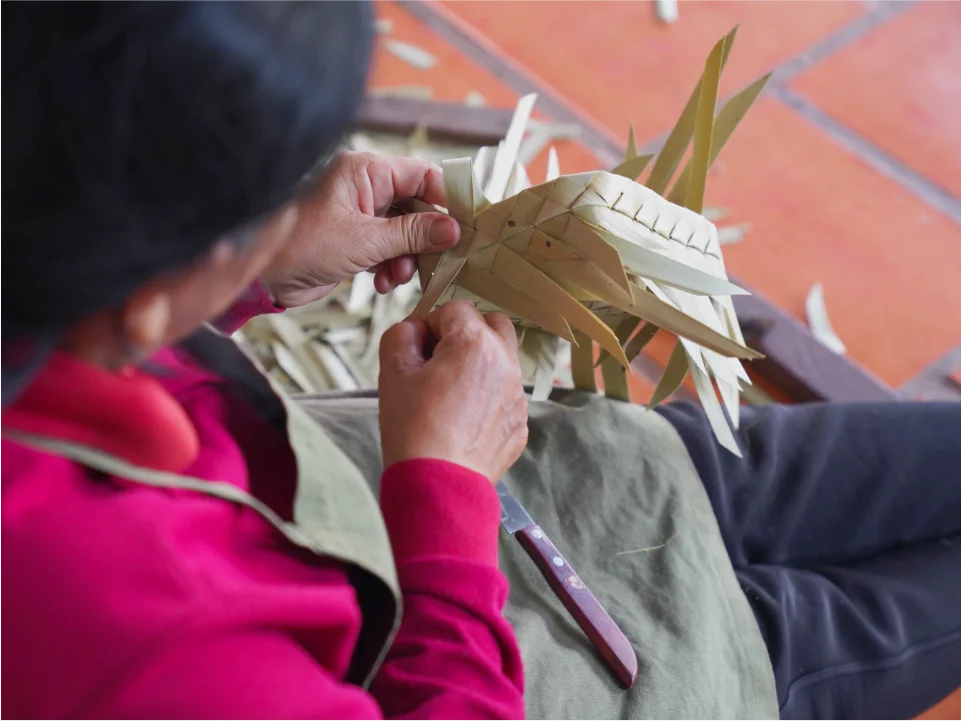Close-up of an artisan’s hands weaving a Smok box, highlighting the intricate and delicate craftsmanship of the traditional sugar palm leaf packaging.