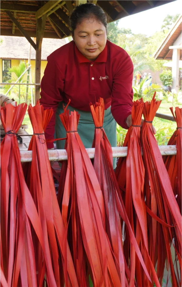 The sugar palm tree is one of Cambodia’s national icons; it plays a very important role in providing material for many home uses as the leaves are used as thatch for roof and walls, mats, baskets … At Senteurs d’Angkor, we use theses leaves to create boxes as a packaging for our products. Our artisans come from Kravann village where we provide sustainable work to 80 other women.